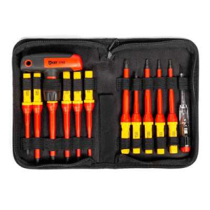 Состав набора - диэлектрическая бита - шлиц 3.0х100, диэлектрическая бита - шлиц 4.0х100, диэлектрическая бита - шлиц 5.5х100, диэлектрическая бита - шлиц 6.5х100, диэлектрическая бита - PH1х80, диэлектрическая бита - PH2х100, диэлектрическая бита - PZ1х80, диэлектрическая бита - PZ2х100, диэлектрическая бита - Т10х100, диэлектрическая бита - Т15х100, диэлектрическая бита - Т20х100. тестер напряжения 110–250 В. Т-образная диэлектрическая рукоятка для сменных бит. Для работы под напряжением до 1000 В. Материал стержня бит - хром-ванадиевая сталь. Вороненые намагниченные наконечники. Материал изоляции бит - полипропилен. На каждой бите — маркировка типоразмера. Двухкомпонентная Т-образная рукоятка с мягкими вставками из термопластрезины. Патентованный пружинный механизм фиксации биты в рукоятке. Упаковка - прочная сумка на молнии. Вес набора - 840 г. Габариты сумки - 220х135х50 мм