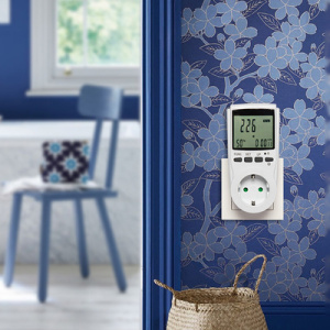 Бытовые ваттметры в розетку (счетчики потребляемой энергии) используются для замера потребляемой мощности различными электроприборами, такими как чайник, холодильник, телевизор, кондиционер, обогреватель, стиральная машина, суммарный ток которых не превышает 16А. Осуществляют контроль над потреблением энергии устройствами, подключенными к устройству через стационарный сетевой шнур. Благодаря функции смены отображаемого дисплея ваттметры дополнительно показывают напряжение и частоту тока сети, потребляемую прибором силу тока и мощность в киловатт-часах, суммарную потребленную прибором мощность в киловатт-часах и общую стоимость электроэнергии. Ваттметры оснащены возможностью установки цены киловатт-часа, что позволяет одновременно рассчитать суммарную стоимость потребленной электроэнергии.