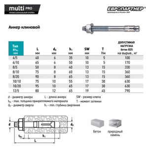 Клиновой оцинкованный анкер MULTI PRO с регулируемым моментом затяжки предназначен для использования в сжатом (без трещин) и растянутом бетоне. Анкер заранее собран и готов к прямому сквозному монтажу. Устанавливается в сухих помещениях.