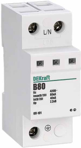 Ограничитель перенапряжения серии ОП-101 DEKraft , 1P, макс.разрядный ток 80 кА, мак.рабочее напряжение 440 В, класс 1(B), монтаж - на DIN-рейку, ширина - 1 модуль х 18 мм. Ограничители срабатывают за миллиардную долю секунды и надежно защищают оборудование от бросков напряжения. Повышенный уровень защиты позволяет ограничить перенапряжения до 2,2 кВ. Ограничитель оснащен сигнальным контактом. Применяются во ВРУ, ГРЩ, распределительных щитках, коробках и непосредственно возле аппаратов.