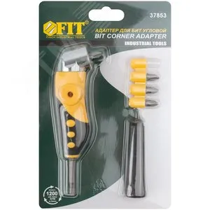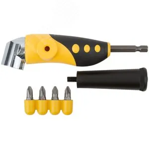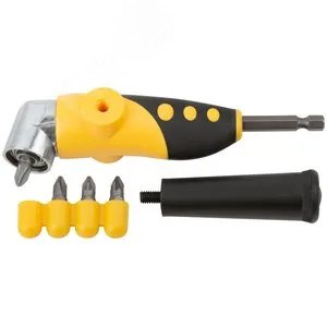 Адаптер для бит. Угол 105 градусов. Для работы с электродрелями и шуруповертами. Переставная ручка. В комплекте 4 биты из CR-V стали PH2, PH2, PZ2, PZ2. Материал - корпус из ударопрочного ABS пластика, пластиковая ручка. Упаковка - блистер.