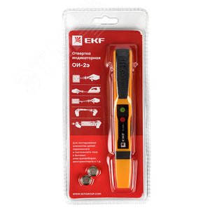 Отвертка индикаторная EKF PROxima – распространенное устройство для безопасного определения контактным и бесконтактным способом наличия электрического тока в электрических сетях с напряжением 220 В, а также прозвонки целостности электрических цепей (электрических лампочек, предохранителей, проводов, вилок и т. д.). Принцип действия индикатора очень прост. Для проверки наличия напряжения в сети необходимо коснуться жалом отвертки-индикатора оголенного проводника, при наличии в сети электрического тока светодиод сработает.