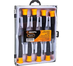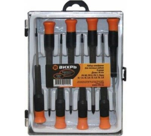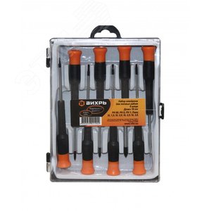 Набор отвёрток для точных работ НОТ 8 ''ВИХРЬ'' предназначен для завинчивания и отвинчивания резьбовых соединений маленького размера. Отвертки из данного набора незаменимы при работе с электроникой, часами и прочими мелкими соединениями. Тыльная сторона отвертки оснащена поворотной шайбой. При помощи шайбы можно легко и быстро вращать инструмент простым перебором пальцев. Набор упакован в пластиковый бокс. В набор входят следующие отвёртки- PH00, PH0, PH1, AWL, SL1,5, SL2,0, SL2,5, SL3,0.