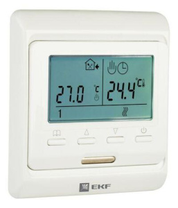 Терморегуляторы серии ett-1 EKF Proxima рекомендуются для автоматического регулирования температуры в помещениях, оборудованных кабельными системами отопления ''теплый пол'' с использованием встроенного и выносного датчика температуры. Терморегулятор предназначен для скрытого монтажа в стандартную монтажную коробку. Функция недельного программирования даёт возможность автоматически поддерживать различную температуру на каждый день. Рекомендован для установки с любыми системами электрического обогрева (резистивные кабели и маты, инфракрасная нагревательная пленка и т.д.) мощностью не более 3500 Вт (16А).