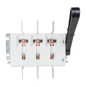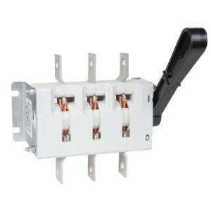 Выключатель-разъединитель 3 полюсный на номинальный ток 250 А, в котором установлена несъемная рукоятка. Преимущества: Конструкция контактной системы ножевого типа с двойным видимым разрывом цепи, Наличие вспомогательных контактов, Широкий выбор типоисполнений: по номинальному току, по виду ручного привода, по количеству направлений и полюсов, по расположению контактных выводов, Токоведущие элементы изготовлены из высококачественной меди марки М1, Применение механически прочных и неподдерживающих горение пластических материалов, Корпус изготовлен из стеклонаполненного премикса, обладающего теплостойкостью, высокими прочностными и электроизоляционными свойствами.