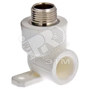 Комбинированный угловой фитинг с креплением (полипропиленовая водорозетка), предназначенный для подсоединения к полипропиленовому трубопроводу сантехнического смесителя или другого компонента инженерной системы с резьбовым подключением. Резьба фитинга – внутренняя трубная по ГОСТу 6357.