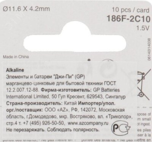 Батарейка пуговичная алкалиновая GP 186A - 10 шт., каждая в своем отрывном блистере