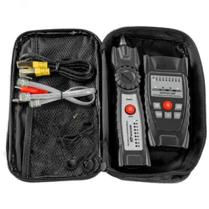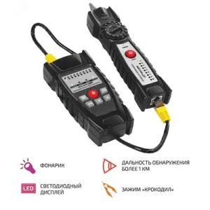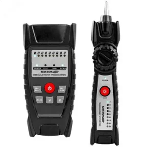Кабель-тестер МЕГЕОН 40067 был спроектирован для реализации функционала тестирования кабелей обжатых разъёмами RJ-45, RJ-11 и отдельных жил. Режимы работы прибора: кабель-тест, сканирование с необходимой скоростью операции. Комплект состоит из двух модулей: передающий и щуп-приёмник. Возможности прибора дадут полное представление о сложившейся ситуации, он способен: Проверять проводимость и общее состояние кабеля, определять замыкание, обрыв, наличие напряжения, скрытые коммуникации. Это незаменимый набор для специалиста. Приёмник оснащен светодиодным фонариком для использования в условиях плохой освещённости и труднодоступных местах, а порты RJ11, RJ45 и адаптера типа ''крокодил'' позволяют подключаться к коммуникационным сетям и отдельным проводникам. Громкость динамика щупа-приёмника настраивается. Дальность работы превышает 1 километр. Приёмник питается от батареи 9 В, тип 6F22 ''крона'', передатчик от 3-х батарей ААА 1,5В.
