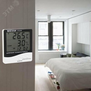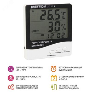 Цифровой термогигрометр МЕГЕОН 20209 представляет собой двухзонный электронный термометр совмещенный с цифровым гигрометром. Прибор оснащен большим высококонтрастным жидкокристаллическим дисплеем, на котором одновременно отображаются температура, влажность и текущее время, а использование современной элементной базы позволило достичь высокой точности измерений температуры и влажности. Благодаря современному эргономичному дизайну термогигрометр идеально впишется в интерьер любого дома, а функция фиксации минимального/ максимального значений температуры будет полезной при использовании прибора в загородных домах и складских помещениях. Измеритель также успешно заменит настольные часы и станет незаменимым помощником, способным заменить три отдельно взятых изделия: термометр, гигрометр и будильник.