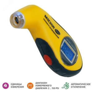 Цифровой автомобильный манометр МЕГЕОН 36002 предназначен для измерения давления в шинах транспортных средств. Изделие имеет специальную форму наконечника, что значительно упрощает выполнение измерений. Наличие подсветки наконечника и дисплея позволяет выполнять измерения в любое время суток. Порядок работы достасточно прост и не требует специальных навыков. Достаточно включить прибор, выбрать единицу измерения, а после этого плотно прижать подсвечивающийся наконечник к вентилю колеса. На дисплее отобразится измеренное значение, которое будет зафиксировано на экране в течение 5 секунд. Изделие имеет небольшу массу и размеры, но достаточно прочный корпус, который гарантирует долгий срок службы, а благодаря удобному расположению органов управления достигается максимальное удобство при эксплуатации.