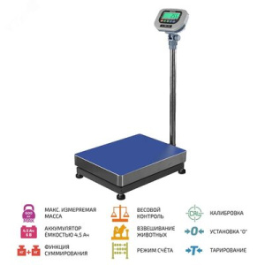 МЕГЕОН 50460W - новинка в модельном ряду напольных весов с электронно-цифровым управлением. Диапазон измерения представленной модели позволяет проводить взвешивание продукции от 50 грамм до 600 килограмм. Функциональные способности выгодно отличаются от большинства подобных товаров имеющихся в продаже. К преимуществам можно отнести: подсчёт количества объектов на грузовой платформе, функция весового контроля, режим взвешивания животных и возможность суммирования массы. Приятным дополнением является наличие сервисных настроек и калибровки, не требующей специальных навыков. Все значения отображаются на большом ЖК- дисплее с яркой светодиодной подсветкой. Автономность работы обеспечивает встроенная аккумуляторная батарея напряжением 6 В и ёмкостью 4,5 Ач. Изделие по достоинству оценят работники предприятий общественного питания, торговых организаций, почты, различных видов производства, сельского хозяйства и других отраслей.
