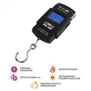МЕГЕОН 50001 - электронный весы с обширным выбором функциональных возможностей. Корпус прибора получил простой дизайн без излишеств, простое управление и яркую светодиодную подсветку ЖК-дисплея. Благодаря небольшим габаритным размерам и весу достигается удобство при эксплуатации и хранении, а подсвечивающийся экран позволяет проводить работы в условиях недостаточной видимости и даже в тёмное время суток. Также на улучшение использования повлияла функция автоматической калибровки и четыре единицы измерения. Применение тензометрического датчика и микропроцессора высокой производительности благоприятно сказалось на увеличении скорости обработки информации и уменьшении базовой погрешности при взвешивании. Безмен станет прекрасным помощником по хозяйству и других сферах жизнедеятельности человека. Изделие по достоинству оценят профессионалы и любители.