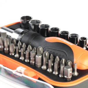46 предметов - отвертка-трещотка с битами и торцевыми головками, CR-V, 2-х компонентная рукоятка. Биты 25мм 35 шт. - SL3мм,SL4мм,SL5мм,SL6мм,SL7мм,SL8мм, PH0,PH1,PH1,PH2,PH2,PH3,PH3,PZ0,PZ1, PZ2,PZ3, T10,T15,T15,T20,T20,T25,T25,T27,T30, H2,H3,H4,H5,H6, S0,S1,S2,S3. Адаптер для торцевых головок 1/4''. Торцевые головки 9шт 1/4'' - 4мм,5мм,6мм,7мм,8мм,9мм,10мм,11мм,12мм.