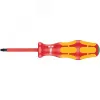 Отвёртка Wera VDE с многокомпонентной ручкой Kraftform Plus для работы в быстром и щадящем режиме - твердые зоны ручки для высокой скорости работы, в то время как мягкие зоны ручки обеспечивают передачу больших моментов силы. Поштучная проверка в водяной бане под напряжением 10000 В для безопасной работы на оборудовании с максимально допустимым напряжением 1000 В. Идентификаторы инструментов ''Take it easy'' с цветовой кодировкой профиля и гравировкой размера - для простого и быстрого отбора требуемого инструмента. Шестигранный край ручки для защиты от перекатывания отвёртки на рабочем месте.