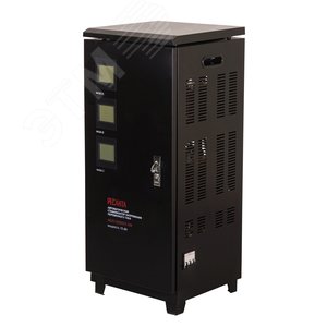 Трёхфазный стабилизатор напряжения электромеханического типа Ресанта АСН-15 000/3 предназначен для выравнивания сетевого напряжения в диапазоне от 240 до 430 В до номинального в 380 В трехфазной сети. Точность стабилизации составляет ±2%. Стабилизатор рассчитан на номинальную нагрузку в 15 кВт. Стабилизатор оснащён 3-мя дисплеями для удобного контроля основных параметров. Частотные помехи на входе и выходе нивелируются встроенными фильтрами. Стабилизатор выполнен в металлическом корпусе. Для охлаждения устройства предусмотрены вентиляционные отверстия в стенках корпуса. Аппарат защищён от перегрузок и перегрева. При значительном превышении входящего напряжения стабилизатор автоматически отключает подачу питания и автоматически возобновляет её после возвращения входного напряжения в рабочий диапазон.