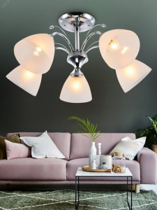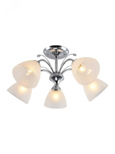 "Люстры потолочные Liselotte - новинка итальянского бренда Rivoli. Созданы в рамках серии ""Лайт"", в которую входят простые недорогие люстры европейского дизайна. Данная модель имеет 5 белых матовых плафонов из стекла. Освещаемая площадь этой люстры - 15 м2. Идеально для стандартной кухни, спальни, детской, небольшой гостиной. Фишкой в декоре люстры в гостиную Liselotte стали тоненькие веточки из металла, которыми украшен корпус. Для окрашивания арматуры этой люстры на кухню выбран модный цвет хром. При этом не выйдет из моды, ведь традиционная форма плафонов-колокольчиков актуальна во все времена. Такие плафоны направляют свет вниз, грамотно концентрируя световой поток."