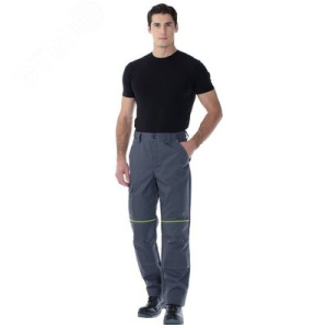 Брюки с гульфиком с застежкой на петли и пуговицы. Пояс со шлевками для ремня и с эластичными вставками по бокам для регулировки объема. На передних половинках - верхние карманы с боковым входом, на задних половинках - верхние накладные карманы с объемом в нижней части, левый карман с клапаном. На правой брючине на уровне середины бедер - накладной карман с клапаном и малым накладным карманом с отделениями для мелких инструментов. Усилительные накладки в области коленей и карманы для амортизационных вкладышей под ними. Яркие канты над коленями.