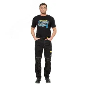 Брюки с яркими элементами фурнитуры и множеством функциональных деталей и карманов, боковой карман с клапаном спереди с отделом на молнии для мелких деталей, боковой карман сзади для инструментов, верхние передние карманы и задние накладные карманы, усилительные накладки в области коленей и по низу из отделочной прочной ткани, карманы на коленях для амортизационных вкладышей, световозвращающие канты спереди и сзади на кокетке, застежка на молнию и металлическую пуговицу спереди, съемный пояс из ременной стропы на пластиковой пряжке.