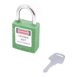 Замок навесной. Пластиковый корпус устойчивый к УФ-лучам, химически агрессивным средам и температурам, размер корпуса 45x40x20 мм (ВxШxГ), дужка из нержавеющей стали, высота от корпуса до дужки 25 мм, диаметр дужки 6 мм, латунный цилиндр (6 пин) с 1 ключом, цвет корпуса зеленый, система ключей KA/KD/MK/KAMK.