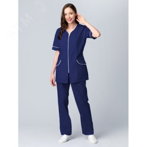 Куртка удлиненная полуприлегающего силуэта, центральная застежка на молнию, короткий втачной рукав, V-образный фигурный вырез горловины, боковые вместительные карманы с клапанами, регулировка объема по талии вшивным поясом, клапаны карманов, горловина и рукава отделаны атласным белым кантом. Брюки прямого силуэта на притачном поясе на резинке.