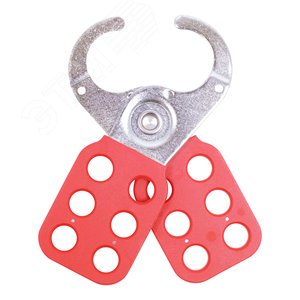 Накладка множительная без ограничителя затвора из оцинкованной стали и винилового покрытия. Диаметр зажимного кольца 25 мм. Рассчитана на 6 навесных замков (дужка не более 10,5 мм). Устойчива к УФ-лучам, химически агрессивным средам и температурам. Цвет винилового покрытия красный.