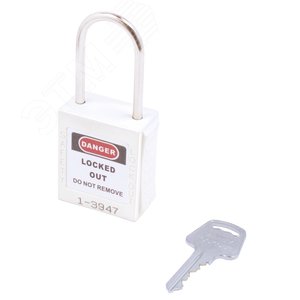 Замок навесной. Пластиковый корпус устойчивый к УФ-лучам, химически агрессивным средам и температурам, размер корпуса 45x40x20 мм (ВxШxГ), дужка из нержавеющей стали, высота от корпуса до дужки 38 мм, диаметр дужки 4 мм, латунный цилиндр (6 пин) с 1 ключом, цвет корпуса белый, система ключей KA/KD/MK/KAMK.