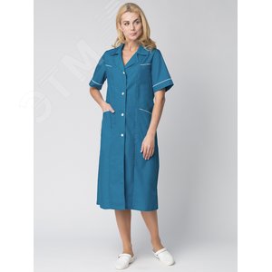 Халат прямого силуэта, длина ниже колена, центральная застежка на пуговицы, втачной короткий рукав, задняя шлица, отложной английский воротник, боковые вместительные карманы, нагрудный ассиметричный карман, регулировка объема по талии шивным поясом на пуговице, контрастным белым кантом отделаны кокетка, карманы и манжеты.