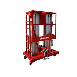 Двухмачтовый телескопический подъемник SKYER GTWY12-200 AC/DC — надежное устройство для подъема людей и грузов на высоту до 14 м для проведения монтажных, ремонтных и других работ. Оборудован специальной скобой для зацепа страховочного троса. Грузоподъемность модели составляет 0.2 т, что достаточно для подъема двух рабочих и необходимого инвентаря. Выдвижные телескопические мачты из легкого прочного алюминиевого сплава обеспечивают плавный подъем рабочей платформы. Спиртовой уровень позволяет контролировать вертикальное положение подъемника. Выдвижные опоры — аутригеры — обеспечивают модели устойчивость. При необходимости SKYER GTWY12-200 AC/DC можно остановить и спустить с помощью кнопок экстренной остановки и вентильного устройства аварийного спуска платформы. Конструкция закреплена на мобильном основании с гидроэлектроприводом и блоком питания. Малые габаритные размеры и вес позволяют использовать подъемник в условиях ограниченного пространства.