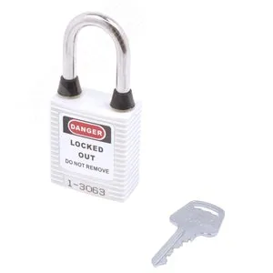 Замок навесной. Пластиковый пылезащищенный корпус устойчивый к УФ-лучам, химически агрессивным средам и температурам, размер корпуса 45x40x20 мм (ВxШxГ), дужка из нержавеющей стали, высота от корпуса до дужки 38 мм, диаметр дужки 6 мм, латунный цилиндр (6 пин) с 1 ключом, цвет корпуса белый, система ключей KA/KD/MK/KAMK.