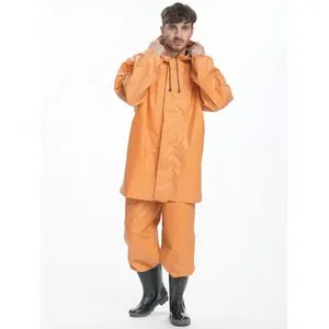 Костюм мужской для защиты от воды тип А, состоящий из куртки с капюшоном и полукомбинезона. Изготовлен из прорезиненной ткани арт.1045 (плотность 550 г/м.кв.) стойкой к действию морской воды, рыбьего жира и нефтепродуктов. Швы проклеены специальной лентой. Рекомендуется для работников рыболовецких хозяйств и рыбоперерабатывающей промышленности. Водоупорность не менее 5000 мм водяного столба.