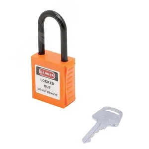 Замок навесной. Пластиковый корпус устойчивый к УФ-лучам, химически агрессивным средам и температурам, размер корпуса 45x40x20 мм (ВxШxГ), дужка из нержавеющей стали, высота от корпуса до дужки 38 мм, диаметр дужки 6 мм, латунный цилиндр (6 пин) с 1 ключом, цвет корпуса оранжевый, система ключей KA/KD/MK/KAMK.