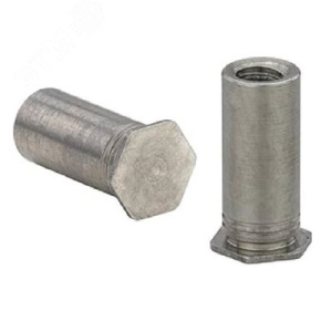 Втулка запрессовочная с внутренней резьбой из оцинкованной стали с увеличенным наружным диаметром. Шестигранная форма основания не позволяет втулке провернуться в металле при увеличенных нагрузках. Имеет посадочный паз специальной формы, в который при установке затекает металл.