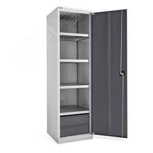 Шкаф металлический, сборно-разборный. Укомплектован четырьмя оцинкованными полками, двумя выдвижными ящиками. Корпуса ящиков сварные. Окрашен порошковой краской на эпоксидной основе.