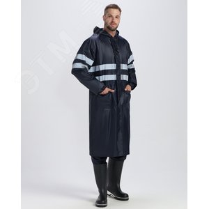 Плащ прямого силуэта, с центральной застёжкой на молнию и ветрозащитной планкой на 5 кнопках. Капюшон не съёмный. Объемные накладные карманы с клапанами. Спинка с двухслойной кокеткой: внутренний слой изготовлен из сетки, отверстия для вентиляции на задней кокетке. Рукав реглан. Манжет на резинке. Задняя шлица. Швы проклеены. Опоясывающие параллельные СОП 50 мм по рукавам спинке и кокетке.