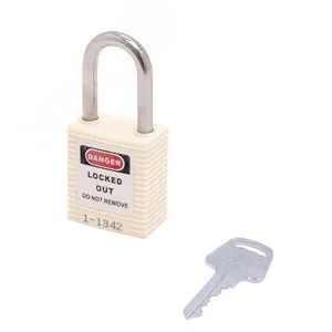 Замок навесной. Пластиковый корпус устойчивый к УФ-лучам, химически агрессивным средам и температурам, размер корпуса 45x40x20 мм (ВxШxГ), дужка из нержавеющей стали, высота от корпуса до дужки 38 мм, диаметр дужки 6 мм, латунный цилиндр (6 пин) с 1 ключом, цвет корпуса белый, система ключей KA/KD/MK/KAMK.