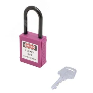 Замок навесной. Пластиковый корпус устойчивый к УФ-лучам, химически агрессивным средам и температурам, размер корпуса 45x40x20 мм (ВxШxГ), дужка из нержавеющей стали, высота от корпуса до дужки 38 мм, диаметр дужки 6 мм, латунный цилиндр (6 пин) с 1 ключом, цвет корпуса фиолетовый, система ключей KA/KD/MK/KAMK.