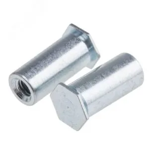 Втулка резьбовая запрессовочная неполнопроходная стальная оцинкованная в форме цилиндра с шестигранной головкой на одном конце и внутренней резьбой на другом, что ограничивает утапливание винта и защищает внутренние части изделия от повреждения слишком длинными винтами.