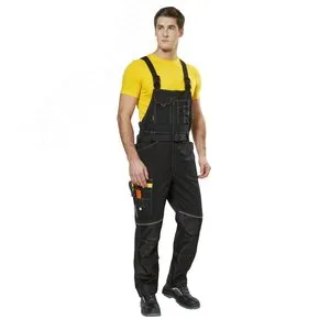 Полукомбинезон с яркими элементами фурнитуры и множеством функциональных деталей и карманов: боковой карман на брюках спереди с отделом для инструментов, задние накладные карманы, карманы с наклонным входом, карманы спереди для документов, телефона и мелких деталей, усилительные накладки в области коленей и по низу из отделочной прочной ткани, карманы на коленях для амортизационных вкладышей, световозвращающие канты спереди и сзади, застежка на молнию под планкой, широкая шлевка на липучке сзади для фиксации съемного пояса с карманами, регулировка объема по талии за счет эластичных вставок по бокам, длина лямок регулируется за счет пластиковых пряжек и эластичных вставок на спинке, съемный пояс из ременной стропы на пластиковой пряжке с навесными карманами с отделениями для мелких деталей и рабочих инструментов.