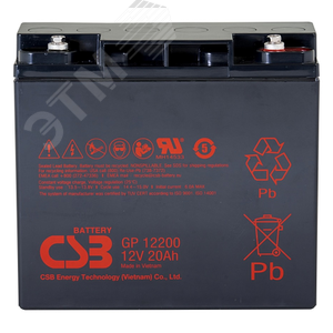 CSB GP 12200 (12 В, 20 Ач) является одним из самых распространенных свинцово-кислотных аккумуляторов общего назначения. Корпус батареи выполнен из долговечного ABS-пластика и имеет предохранительный клапан для сброса избыточного давления. Аккумулятор полностью герметичен (не требует долива воды), а значит может работать в любом положении. CSB GP 12200 выполнен по технологии AGM (стекловолоконный сепаратор, пропитанный жидким электролитом). Срок службы достигает 5 лет или около 260 циклов при 100% разряде. Аккумуляторная батарея CSB GP 12200 имеет усовершенствованную конструкцию легированных кальцием электродов из особо чистого свинца, что обеспечивает продолжительный срок службы и улучшенные разрядные характеристики. Аккумулятор отвечает всем современным требованиям к герметизированным батареям, имеет сертификат соответствия Госстандарта РФ (''Ростест''), заключение ВНИИПО МВД ''О пожаровзрывобезопасности''.