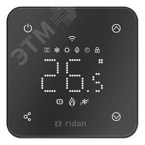Ridan RSmart — электронный термостат с минималистичным дизайном, предназначенный для точного контроля и управления температурой воздуха или пола. Эта модель может подключаться к сети Wi-Fi. Совместим с рамками серий. JUNG - ECO Profi, A 550. Merten - System M. ABB - Basic 55. Werkel - все рамки 55х55. LIREGUS - все рамки 55х55. Berker - B7, Q1, Q3, Q7, S1. Совместим с рамками после механической модернизации. GIRA - System 55 (Standard 55, E2, E3, Event, Esprit и ClassiX). Schneider Electric - Atlas Design. Основные функции. Сменные рамки (стандартный размер 55х55мм). Удалённое управление через приложение Smart Life в смартфоне (программирование). Голосовое управление Яндекс Алиса. Функция открытого окна. Эко-режим. Поддерживает датчик температуры пола. Калибровка датчиков температуры. Защита от замерзания. Настройка яркости подсветки дисплея.