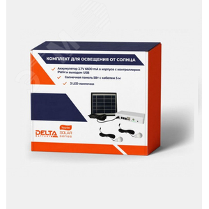 Зарядная мини станция емкостью 6 600 мАч с источником энергии от комплектной солнечной панели и с подключением двух светодиодных ламп, для зарядки мобильных устройств имеются USB порты.