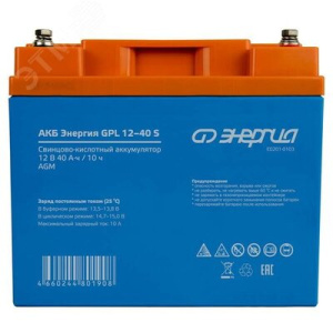 Аккумулятор АКБ Энергия GPL 12–40 S. Аккумуляторные батареи АКБ Энергия GPL 12–40 S изготовлены по технологии AGM и предназначены для эксплуатации в буферном режиме в устройствах бесперебойного электропитания устройств охранной и пожарной сигнализации, информационных и телекоммуникационных систем и других типов оборудования, при работе которых не допускается перерывов в электропитании. Емкость Ач – 40. Напряжение батареи – 12В. Максимальный ток заряда 10 А (1,7 ч). Максимальный ток разряда (5 сек) – 400А. Тип клемм M6х16. Условия эксплуатации – от -20 до +50 градусов Цельсия. Низкий саморазряд. Можно использовать в жилых помещениях. Срок службы АКБ зависит от количества циклов, глубины разрядов, температурного режима, напряжения заряда и других факторов. Если АКБ не эксплуатируется, заряжайте её по крайней мере раз в полгода! Расчетный срок службы АКБ – 12 лет при соблюдении правил эксплуатации. Гарантия 1 год.