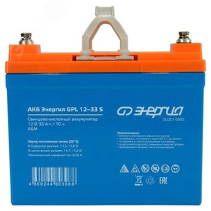 Аккумулятор АКБ Энергия GPL 12–33 S. Аккумуляторные батареи АКБ Энергия GPL 12–33 S изготовлены по технологии AGM и предназначены для эксплуатации в буферном режиме в устройствах бесперебойного электропитания устройств охранной и пожарной сигнализации, информационных и телекоммуникационных систем и других типов оборудования, при работе которых не допускается перерывов в электропитании. Емкость Ач – 33. Напряжение батареи – 12В. Максимальный ток заряда 8,25 А (1,7 ч). Максимальный ток разряда (5 сек) – 330А. Тип клемм M6. Условия эксплуатации – от -20 до +50 градусов Цельсия. Низкий саморазряд. Можно использовать в жилых помещениях. Срок службы АКБ зависит от количества циклов, глубины разрядов, температурного режима, напряжения заряда и других факторов. Если АКБ не эксплуатируется, заряжайте её по крайней мере раз в полгода! Расчетный срок службы АКБ – 12 лет при соблюдении правил эксплуатации. Гарантия 1 год.