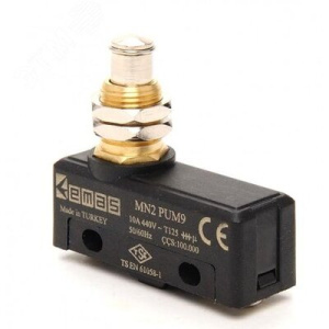 Мини-выключатель с роликом, плунжером по продольной оси с креплением на педали. Механическая стойкость не менее 500 000 операций. Электрическая стойкость не менее 100 000 операций. Рабочая температура T125. Максимальная частота включений 60 механических операций в минуту, 30 электрических операций в минуту. Номинальное напряжение, Ue 440 В перем. тока. Номинальный ток, Ie 10 А. Сопротивление изоляции не менее 10 МОм (500 В пост. тока). Сопротивление контактов не более 15 МОм. Диэлектрическое сопротивление 1500 В перем. тока (1 минута). Влажность не более 80%. Стандарты TS 1472 EN 61058-1.