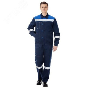 Костюм состоит из куртки и полукомбинезона. В куртке - широкие световозвращающие полосы по низу кокеток, супатная застежка на пуговицы, кокетки из отделочной ткани, воротник отложной, нагрудный карман на правой полочке с отделением для ручки, накладные карманы в нижней части куртки, рукава с манжетами на пуговицах по низу, широкие световозврающие полосы на рукавах. Полукомбинезон - с накладными карманами на передних половинках, спереди в области груди карман с несколькими отделами для инструментов, застежка сбоку на пуговицы, регулировка объема по талии за счет эластичной вставки сзади, лямки на пластиковых застежках (фастексах), регулирующихся по длине за счет эластичной резинки, в области коленей усилительные накладки, по низу широкие световозвращающие полосы, гульфик на ''молнии''.