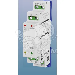 Реле температурной защиты предназначено для защиты оборудования (электрические двигатели, машины, подшипники и т.д.), оборудованного встроенными температурными терморезистивными датчиками (позисторами), от перегрева. Реле выпускаются в унифицированном пластмассовом корпусе с передним присоединением проводов питания и коммутируемых электрических цепей. Крепление осуществляется на монтажную шину DIN шириной 35мм или на ровную поверхность. Для установки реле на ровную поверхность, фиксаторы замков необходимо переставить в крайние отверстия, расположенные на тыльной стороне корпуса. Конструкция клемм обеспечивает надежный зажим проводов сечением до 2,5 мм2. На лицевой панели прибора расположены - зеленый индикатор включения питания U, желтый индикатор срабатывания встроенного исполнительного реле, красные индикаторы 'КЗ датчиков' и 'Перегрев' для визуального анализа аварийных режимов двигателя.