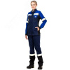 Костюм состоит из куртки и брюк. Куртка удлиненная, с застежкой на молнию под планкой. Многофункциональные нагрудные карманы (в том числе для персональных документов, паспорта), объемный карман с клапаном для средств связи, карман с клапаном со съемным окном под бейдж на липучке. Пластиковое полукольцо для крепления пропуска. Нижние карманы в швах рельефов. Спинка с вертикальными рельефами. Воротник отложной. Внутренняя кулиса по талии спинки для регулировки объема. Рукава с манжетами на кнопке. Усилительные накладки в районе локтей. Брюки с застежкой на гульфик с молнией, с поясом со шлевками. На поясе эластичные вставки по бокам для регулировки объема. На передних половинках верхние карманы с боковым входом. На задних половинках верхние накладные карманы с объемом в нижней части и карманы для инструментов. По низу кокеток, на рукавах куртки и по низу брюк световозвращающие полосы.