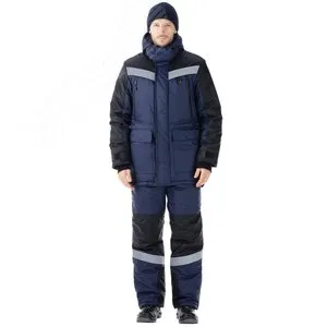 Костюм мужской утепленный, состоит из удлиненной куртки и полукомбинезона. Куртка с центральной застежкой на молнию под ветрозащитной планкой на липучках. Верхние нагрудные утепленные карманы на прорезиненных водоотталкивающих молниях, защищающих содержимое от попадания влаги и снега. Вместительные нижние накладные карманы с двойным входом. Под левой кокеткой полочки петля с карабином для съемного окна под бейдж на липучке, внутри левого кармана предусмотрена липучка для бейджа. Капюшон съемный, на молнии, с двойной регулировкой объема по лицевому вырезу и по затылочной части. По низу куртки - кулиса для регулировки объема. Полукомбинезон с центральной застежкой на двухзамковую молнию. Бретели из мягкой эластичной резинки с регулировкой длины и с застежкой на фастексы. На спинке - эластичная тесьма для регулировки объема по талии, на поясе – шлевки. В области коленей, а также по внутренней части низа брючин расположены усилительные защитные накладки для прочности при истирании.