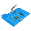 Монтажный коврик МЕГЕОН 02816 предназначен для предотвращения повреждения электро и радиоизделий статическим электричеством. Продуманная конструкция со множеством пронумерованных лотков позволит разместить большое количество компонентов. Дополнительно в поверхность были установлены 4 магнита для надёжной фиксации металлосодержащий элементов и комплектующих. Дополнительно имеются 3 лотка с крышками. В качестве материала был использован термостойкий силикон. Изделие одинаково может использоваться в профессиональной, научной и любительской областях.