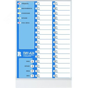 Панель индикации и управления базовая охранная обеспечивает индикацию состояния шлейфов, охранных зон, реле приборов ППКО серии ''А24'', посредством 32-х встроенных индивидуальных трехцветных светодиодных индикаторов, а также общего состояния подключенных приборов посредством встроенных системных светодиодных индикаторов, а также постановку/снятие с охраны охранных зон приборов. Светодиодные индивидуальные индикаторы служат для отображения состояния шлейфов, охранных зон и реле подключенных к ВПУ-А24/700(О) приборов ППКО ''А24''. Имеется возможность увеличения информативности ПИУ-А24Б(О) до 80 индивидуальных индикаторов при подключении к ней одной панели индикации и управления расширения охранной ПИУ-А24Р(О), и до 128 – при подключении двух ПИУ-А24Р(О). ПИУ оборудована: - встроенным звуковым сигнализатором для оповещения. - 2 независимых входа питания для подключения основной и резервной линии питания от внешних ИБП. - выходом RS485 для подключения линии связи к ВПУ-А24/700(О).